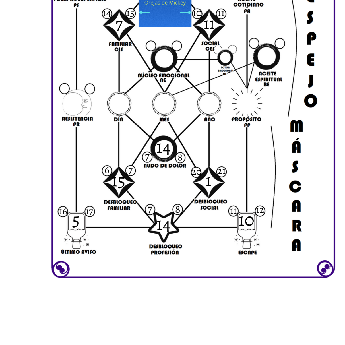 Los números de la carta que no corresponden al núcleo más interno de la personalidad van todos acompañados de otros dos números, ubicados en pequeños círculos en cada una de las posiciones. A estos dos números los llamamos Las Orejas de Mickey, y son un apoyo para el número central de cada posición. Es decir que te ofrecen alternativas, características que en ese ámbito también están en ti aunque quizás no resalten como la principal.